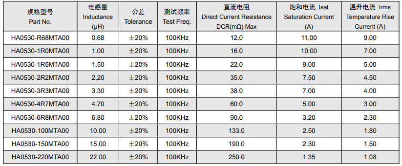 - 超大电流承载能力:HA0530系列电感器可承受高电流,最大饱和电流达11A,温升电流最高9A,满足笔记本电脑、便携式通信设备等高功率场景的稳定运行需求。